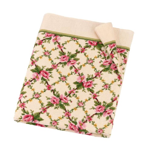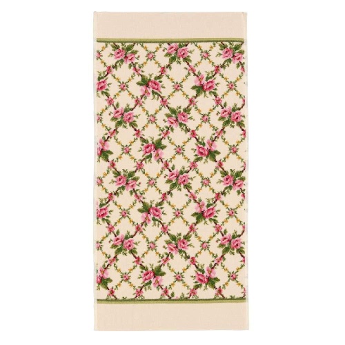 Полотенце украшено элегантным цветочным орнаментом, который дополняется элементами геометрии, придавая изделию стильный и утонченный вид. Особое внимание привлекает яркая оторочка, выполненная в зеленом цвете, которая добавляет полотенцу контраст и акцентирует внимание на его уникальности.