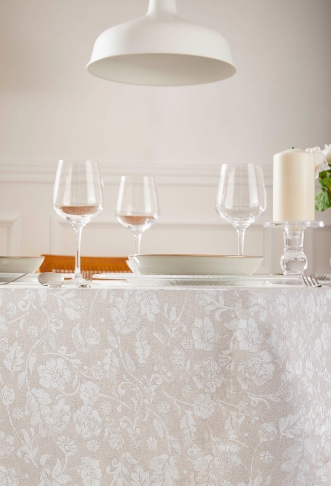 Скатерть Atenas LIVIA нежно бежевого пастельного цвета с белым воздушным цветочным узором. Скатерть Atenas LIVIA - само очарование, она украсит любое торжество и каждый день сделает незабываемым.