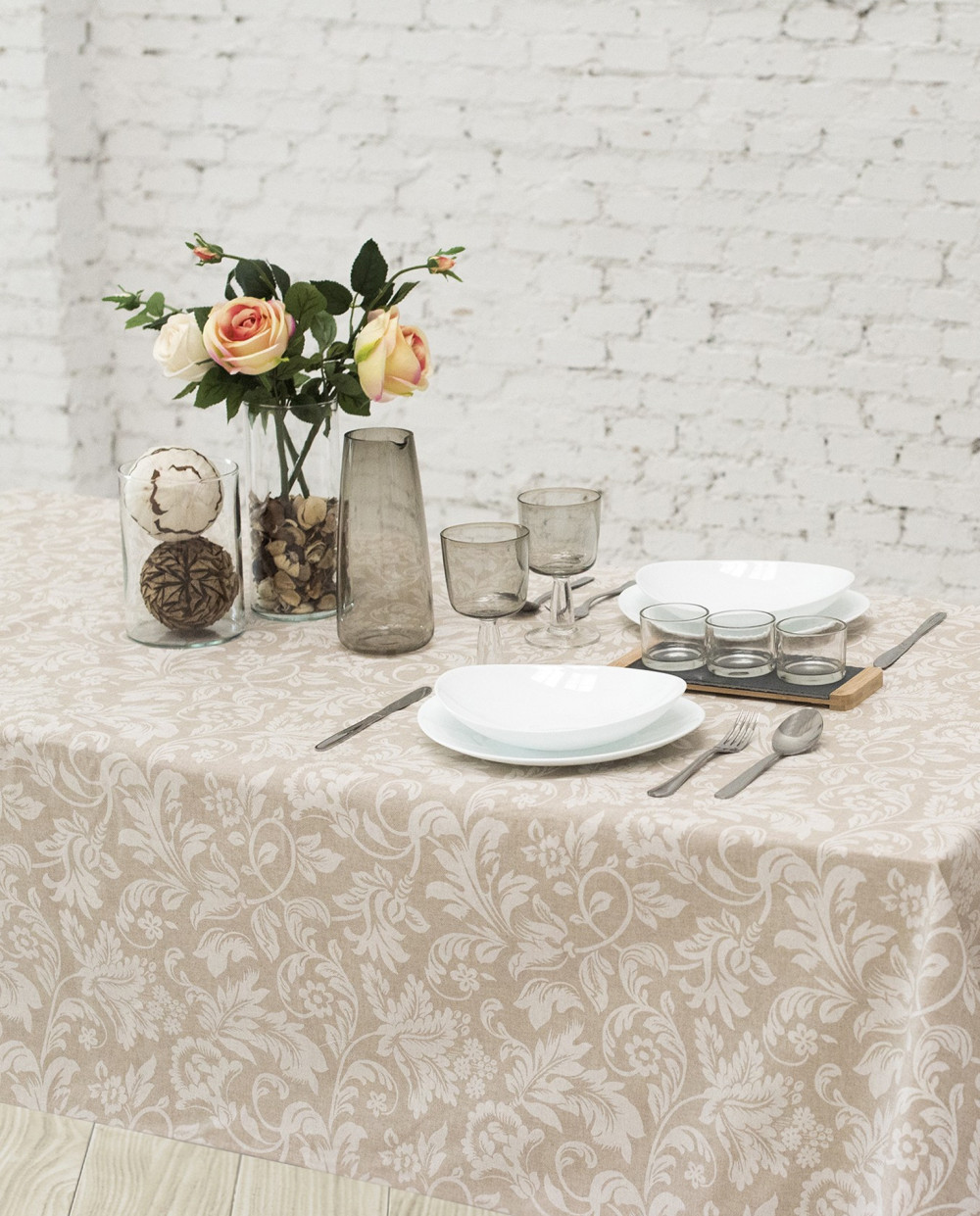 Бежевая скатерть ATENAS VERSALLES с узором в стиле барокко придаст вашему столу выразительности, а любое торжество грандиозностью.